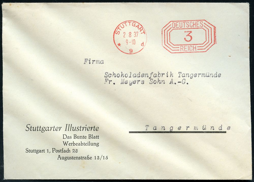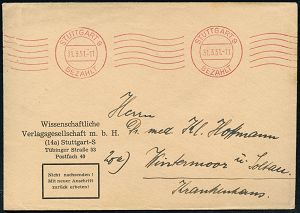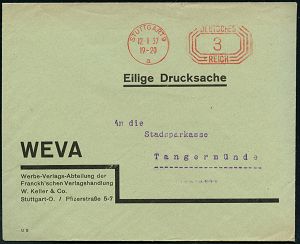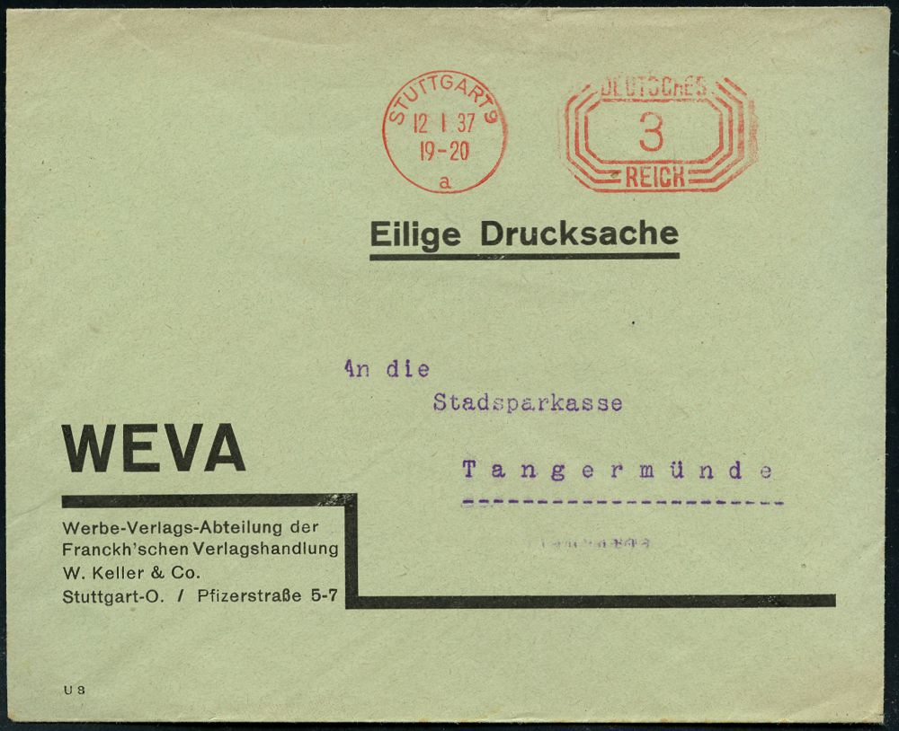 3499 | 8 € | 7000 Stuttgart Maschinen-Postfreistempel : STUTTGART 9/ a/ DEUTSCHES/ REICH 1937 (12.1.) PFS "Achteck" zweizeilig, 3 Pf. auf Firmen-Bf.: WEVA, Werbe-Verlags-Abt. der Franchh´schen Verlagshandlung.. (Dü.D-5) | ![]() | |