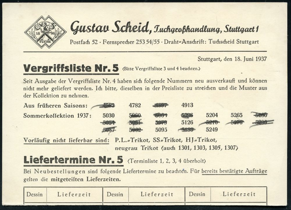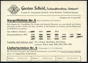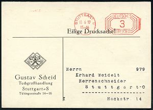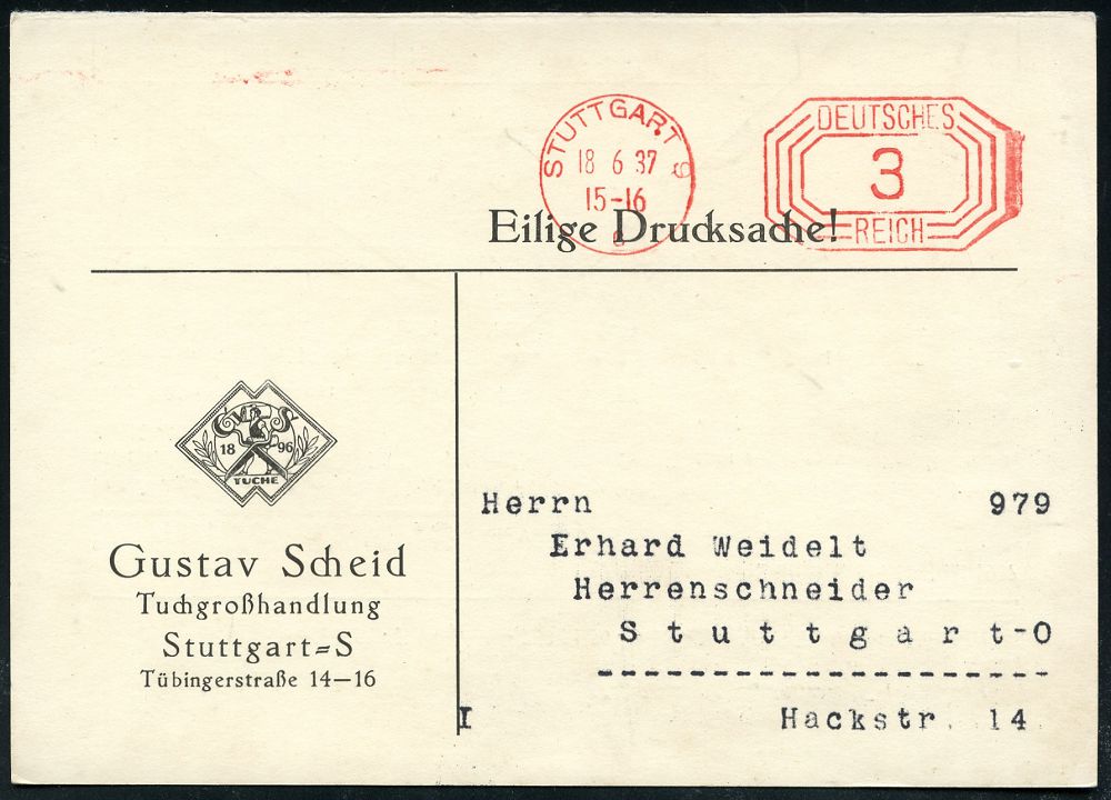 3501 | 15 € | 7000 Stuttgart Maschinen-Postfreistempel : STUTTGART 9/ c/ DEUTSCHES/ REICH 1937 (18.6.) PFS "Achteck" zweizeilig, 3 Pf. auf (halber) Reklame-Kt.: Gustav Scheid, Tuchgroßhandlung.. Text: "Vorläufig nicht lieferbar.. SS-Trikot, HJ-Trikot.." (Dü.D-5) | ![]() ![]() | |