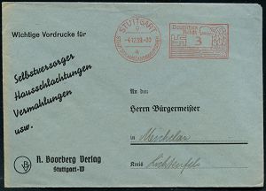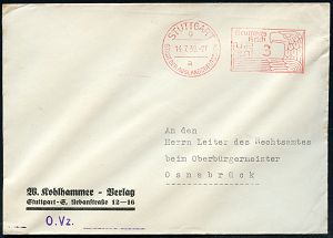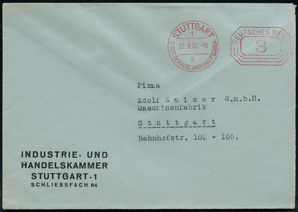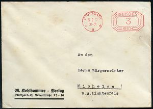 3500 | 6 € | 7000 Stuttgart Maschinen-Postfreistempel : STUTTGART/ *9d/ DEUTSCHES/ REICH 1937 (15.2) PFS "Achteck" zweizeilig, 3 Pf. auf Firmen-Bf.: W. Kohlhammer-Verlag.. (Dü.D-5) | ![]() | |
