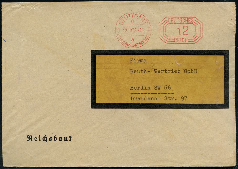 3507 | 12 € | 7000 Stuttgart Maschinen-Postfreistempel : STUTTGART/ 9/ a/ SDA/ DEUTSCHES/ REICH 1938 (22.10.) PFS "Achteck" zweizeilig 12 Pf. = Briefporto! auf Reichsbank-Bf. (Dü.D-5 SDA) | ![]() | |