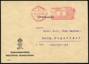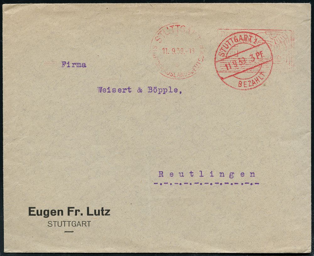 3511 | 20 € | 7000 Stuttgart Maschinen-Postfreistempel : STUTTGART/ 9/ a/ SDA/ Deutsches/ Reich 1939 (11.9.) PFS "Adler/Hakenkreuz" , Wertangabe schwach u. nicht lesbar, daher zusätzlich 1K-Brücken-Hand-PFS: STUTTGART 1/3 Pf./ BEZAHLT (Dü.A-6) Firmen-Bf.: Eugen Fr. Lutz.. n. Reutlingen, ungewöhnliche Doppel-Frankatur! (Dü.D-6) | ![]() | |