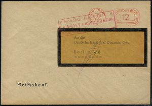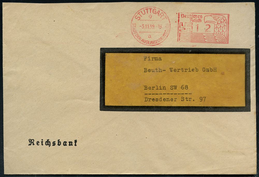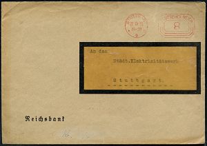 3512 | 12 € | 7000 Stuttgart Maschinen-Postfreistempel : STUTTGART/ 9/ a/ SDA/ Deutsches/ Reich 1939 (3.11.) PFS "Adler/Hakenkreuz" 12 Pf. = Briefporto! auf Reichsbank-Bf. (Dü.D-6) | ![]() | |