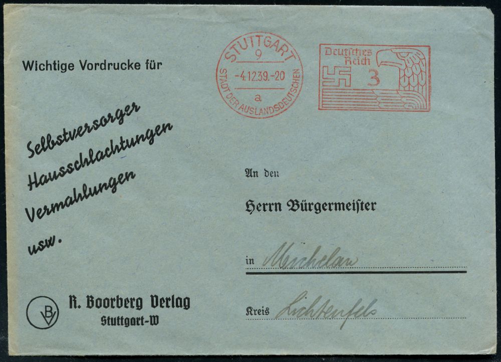 3513 | 8 € | 7000 Stuttgart Maschinen-Postfreistempel : STUTTGART/ 9/ a/ SDA/ Deutsches/ Reich 1939 (4.12.) PFS "Adler/Hakenkreuz" 3 Pf. auf Firmen-Bf.: R. Boorberg Verlag.. (Dü.D-6) | ![]() | |