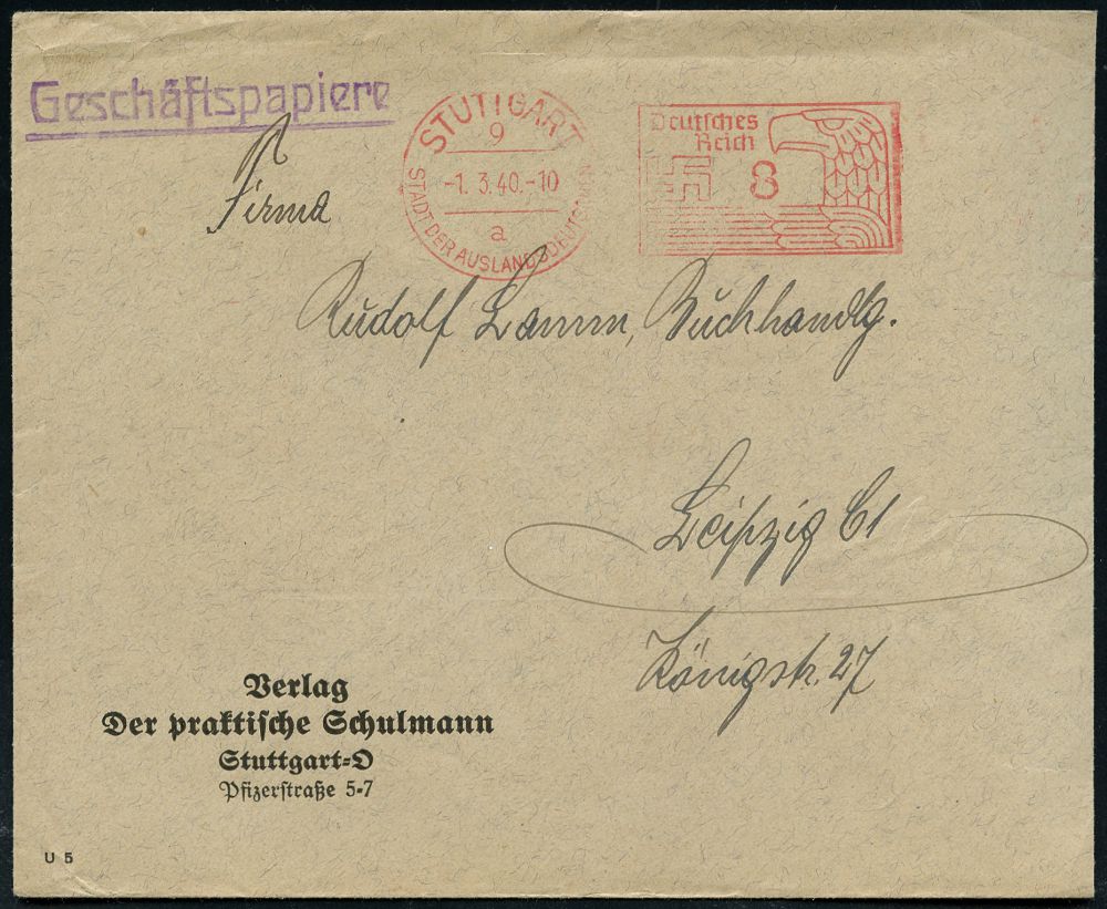 3514 | 10 € | 7000 Stuttgart Maschinen-Postfreistempel : STUTTGART/ 9/ a/ SDA/ Deutsches/ Reich 1940 (1.3.) PFS "Adler/Hakenkreuz" 8 Pf. "Geschäftspapiere" auf Firmen-Bf.: Verlag Der praktische Schulmann.. (Dü.D-6) | ![]() | |