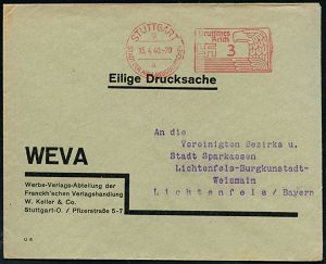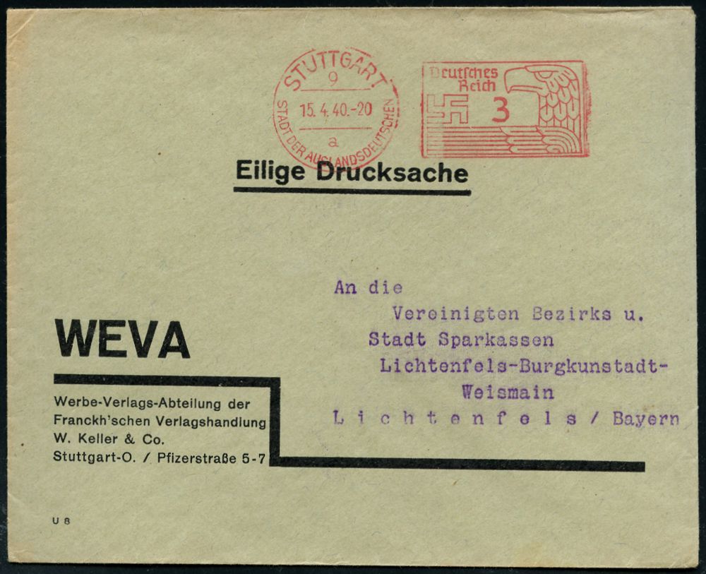 3515 | 8 € | 7000 Stuttgart Maschinen-Postfreistempel : STUTTGART/ 9/ a/ SDA/ Deutsches/ Reich 1940 (15.4.) PFS "Adler/Hakenkreuz" 3 Pf. auf Firmen-Bf.: WEVA, Werbe-Verlags-Abt. der Franckh´schen Verlagshandlung.. (Dü.D-6) | ![]() | |