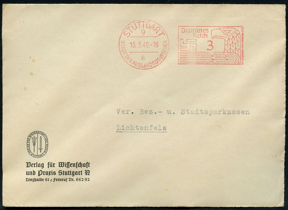3516 | 8 € | 7000 Stuttgart Maschinen-Postfreistempel : STUTTGART/ 9/ a/ SDA/ Deutsches/ Reich 1940 (15.5.) PFS "Adler/Hakenkreuz" 3 Pf. auf Firmen-Bf.: Verlag für Wissenschaft u. Praxis.. mit Merkurstab u. Schwert-Logo (Dü.D-6) | ![]() | |