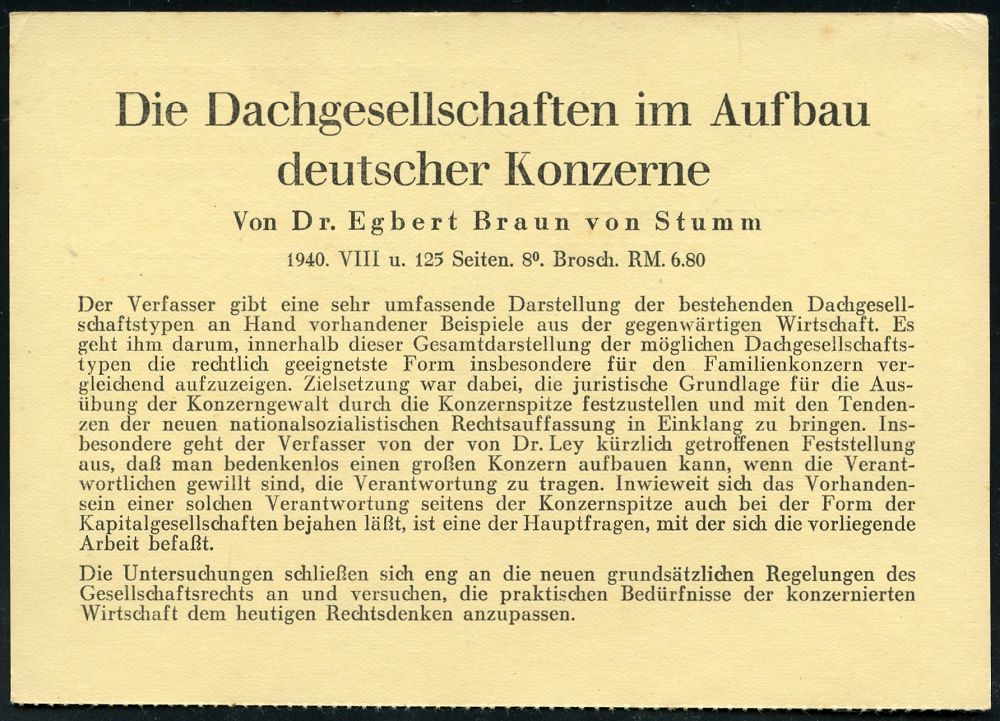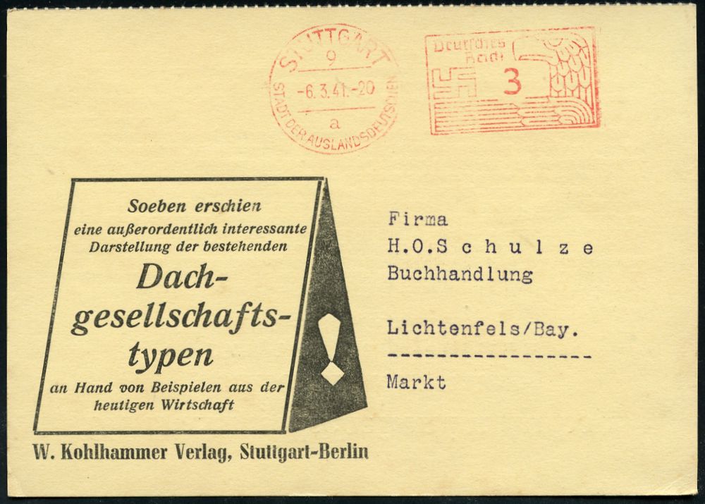 3518 | 12 € | 7000 Stuttgart Maschinen-Postfreistempel : STUTTGART/ 9/ a/ SDA/ Deutsches/ Reich 1941 (6.3.) PFS "Adler/Hakenkreuz" 3 Pf. auf (halber) Reklame-Kt.: W. Kohlhammer Verlag..Die Dachgesellschaften im Aufbau deutscher Konzerne von Dr. Egbert Braun von Stumm.. (Dü.D-6) | ![]() ![]() | |