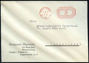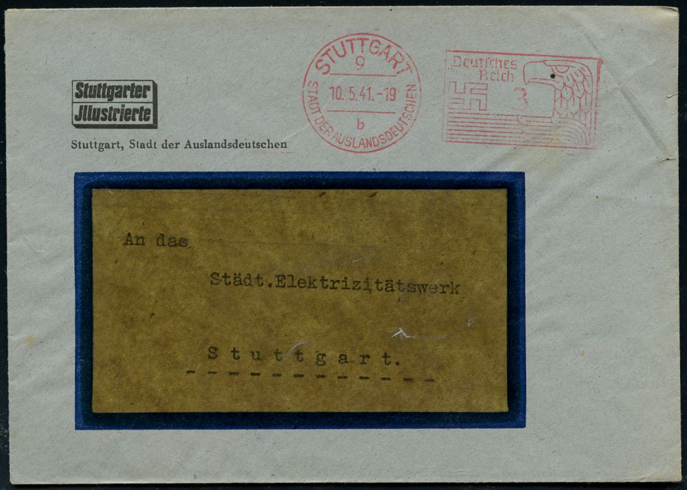 3519 | 8 € | 7000 Stuttgart Maschinen-Postfreistempel : STUTTGART/ 9/ b/ SDA/ Deutsches/ Reich 1941 (10.5.) PFS "Adler/Hakenkreuz" 3 Pf. auf Firmen-Bf.: Stuttgarter Jllustrierte.. (Dü.D-6) | ![]() | |