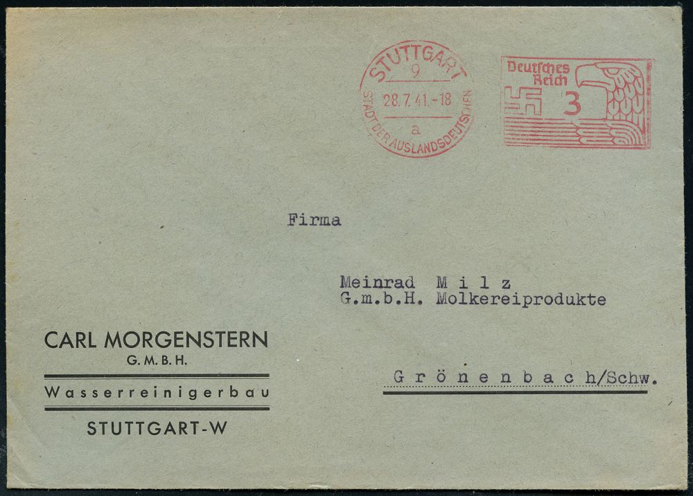 3520 | 8 € | 7000 Stuttgart Maschinen-Postfreistempel : STUTTGART/ 9/ a/ SDA/ Deutsches/ Reich 1941 (28.7.) PFS "Adler/Hakenkreuz" 3 Pf. auf Firmen-Bf.: CARL MORGENSTERN GMBH, Wasserreinigerbau (Dü.D-6) | ![]() | |