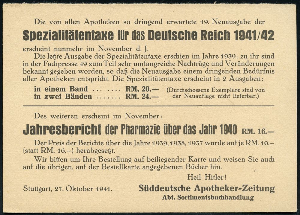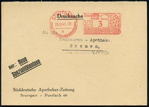 3521 | 10 € | 7000 Stuttgart Maschinen-Postfreistempel : STUTTGART/ 9/ a/ SDA/ Deutsches/ Reich 1941 (29.10.) PFS "Adler/Hakenkreuz" 3 Pf. auf (halber) Reklame-Kt.: Süddeutsche Apotheker-Zeitung.. über Jahresberichte (Dü.D-6) | ![]() ![]() | |