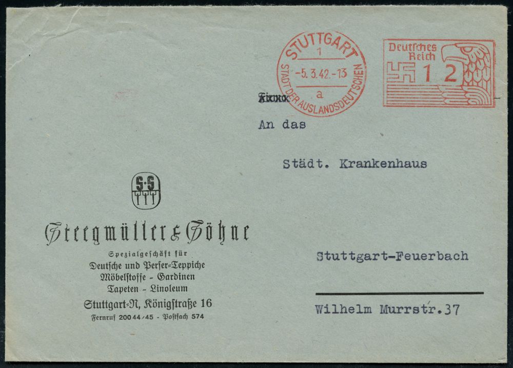 3522 | 8 € | 7000 Stuttgart Maschinen-Postfreistempel : STUTTGART/ 1/ a/ SDA/ Deutsches/ Reich 1942 (5.3.) PFS "Adler/Hakenkreuz" 12 Pf. = Briefporto! , Firmen-Bf.: Stegmüller & Söhne.. Deutsche u. Perser-Teppiche.. (Dü.D-6) | ![]() | |
