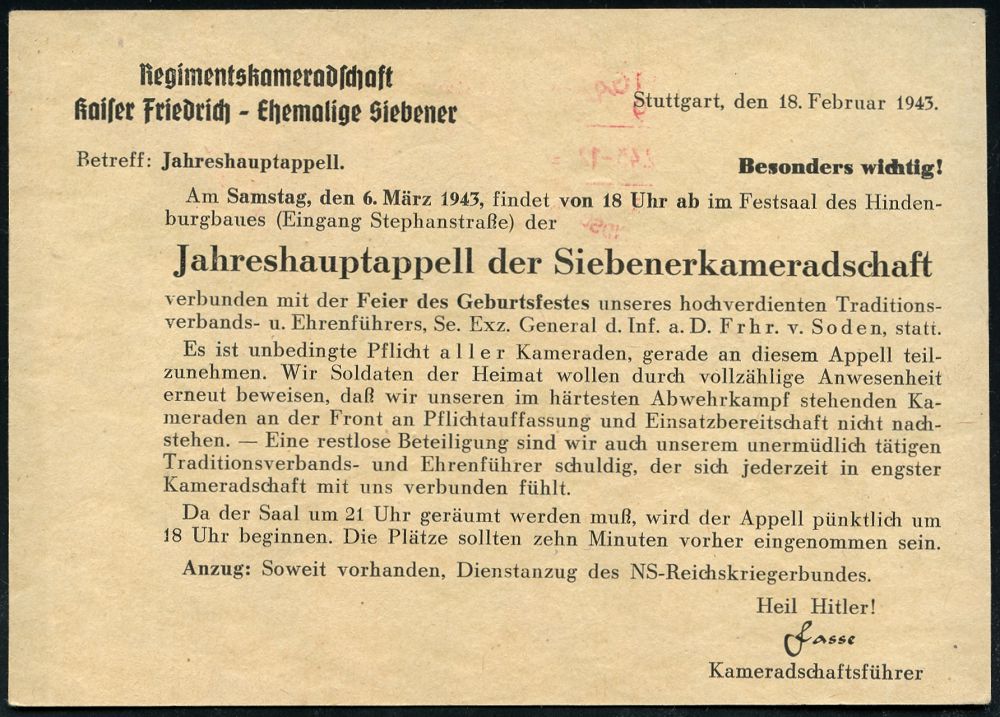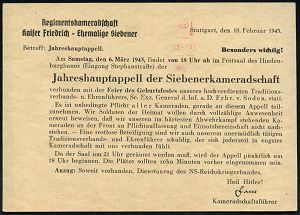 3523 | 15 € | 7000 Stuttgart Maschinen-Postfreistempel : STUTTGATT/ 9/ a/ SDA/ Deutsches/ Reich 1943 (25.2.) PFS "Adler/Hakenkreuz" auf Einladungs-Kt.. Regimentskameradschaft Kaiser Friedrich - Ehemaliger Siebener.. (Jahreshauptappell) Orts-Drs.-Kt. (Dü.D-6) | ![]() ![]() | |