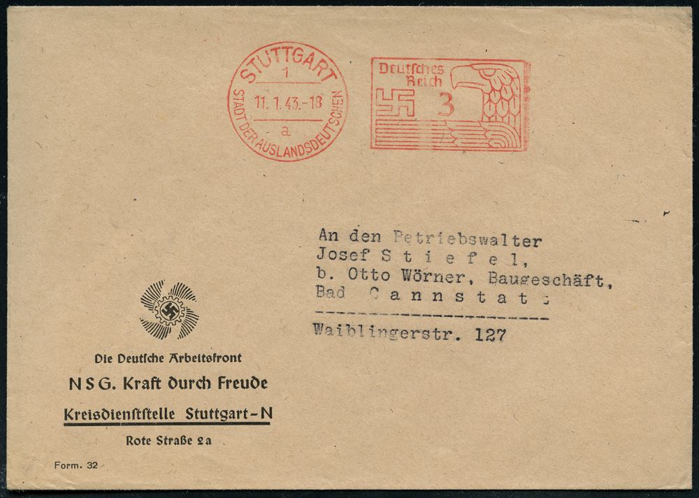 3526 | 15 € | 7000 Stuttgart Maschinen-Postfreistempel : STUTTGART/ 1/ a/ SDA/ Deutsches/ Reich 1943 (11.1.) PFS "Adler/Hakenkreuz" 3 Pf. auf Dienst-Bf.: Die Deutsche Arbeitsfront, NSG Kraft druch Freude.. mit Hakenkreuz-Logo (Dü.D-6) | ![]() | |