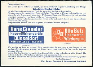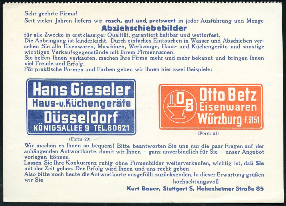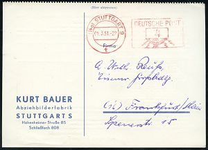 3532 | 15 € | 7000 Stuttgart Maschinen-Postfreistempel : (14a) STUTTGART 9/ t/ DEUTSCHE POST 1951 (1.3.) PFS "Posthorn" (Großbuchstaben) auf Reklame-Kt.: KURT BAUER, Abziehbilderfabrik.., rs. 2 farbige Muster (Dü.D-15, Nr.269) | ![]() ![]() | |