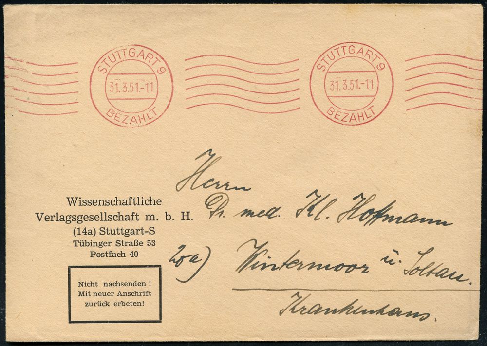 3533 | 8 € | 7000 Stuttgart Maschinen-Postfreistempel : STUTTGART 9/ BEZAHLT 1951 (31.3.) Band-PFS ohne UB mit 6 Wellen auf Firmen-Bf.: Wissenschaftl. Verlagsanstalt mbH (Dü.C-6, Nr.159) | ![]() | |