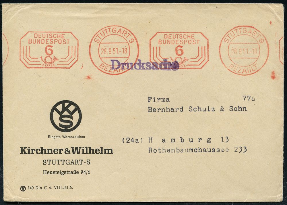 3534 | 8 € | 7000 Stuttgart Maschinen-Postfreistempel : STUTTGART 9/ BEZAHLT/ DEUTSCHE/ BUNDESPOST 1951 (28.9.) Band-PFS "Posthorn" mit Wertangabe 6 Pf. auf Firmen-Bf.: Kirchner 6 Wilhelm.. (Dü.C-8, Nr.163, n u r in Stuttgart verwendet) | ![]() | |