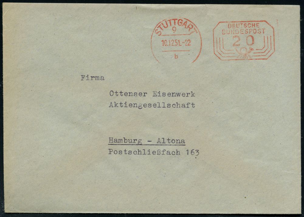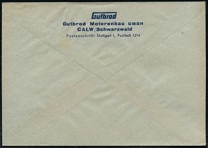 3535 | 15 € | 7000 Stuttgart Maschinen-Postfreistempel : STUTTGART/ 9/ b/ DEUTSCHE/ BUNDESPOST 1951 (10.12.) PFS "Achteck Posthorn" 20 Pf. = Briefporto , rs. Abs.-Vordruck: Gutbrod Motorenbau GMBH, CALW.. = Hersteller von Kleinwagen u. landwirtschaftl. Geräten (Dü.D-16, Nr.272) | ![]() ![]() | |