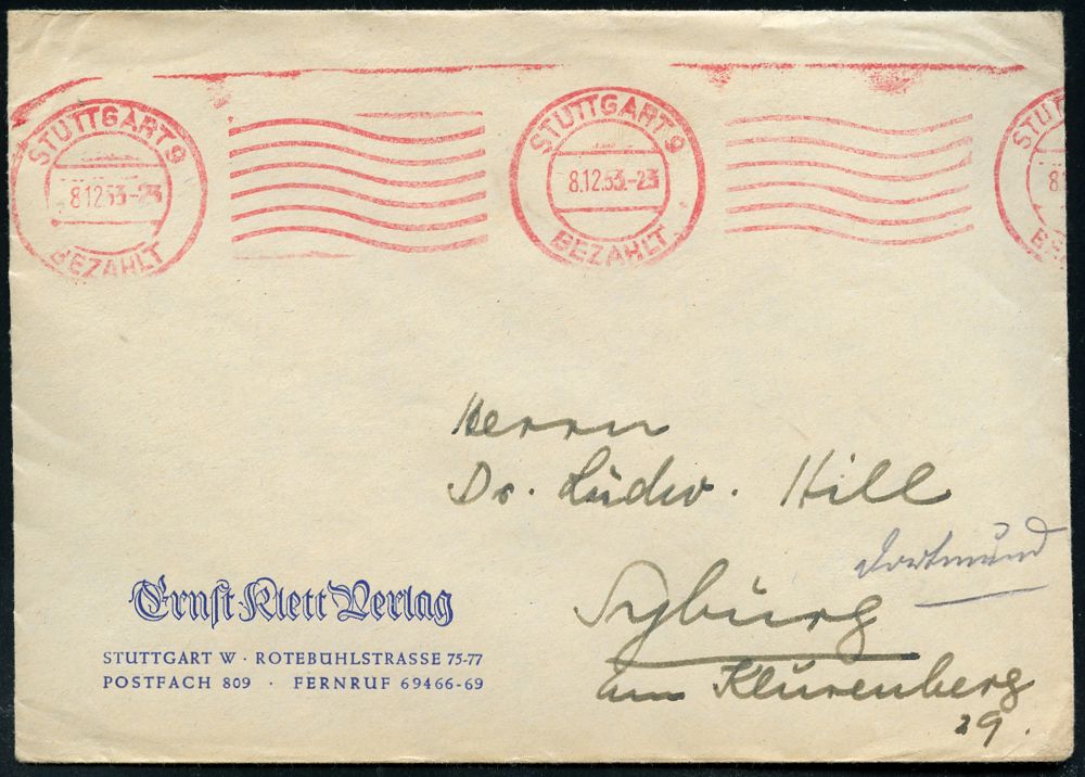 3537 | 8 € | 7000 Stuttgart Maschinen-Postfreistempel : STUTTGART 9/ BEZAHLT 1953 (8.12.) Band-PFS ohne PLZ u. ohne Wertangabe mit 6 Wellen auf Firmen-Bf.: Ernst Klett Verlag.. (Dü.C-6, Nr.159) | ![]() | |