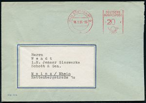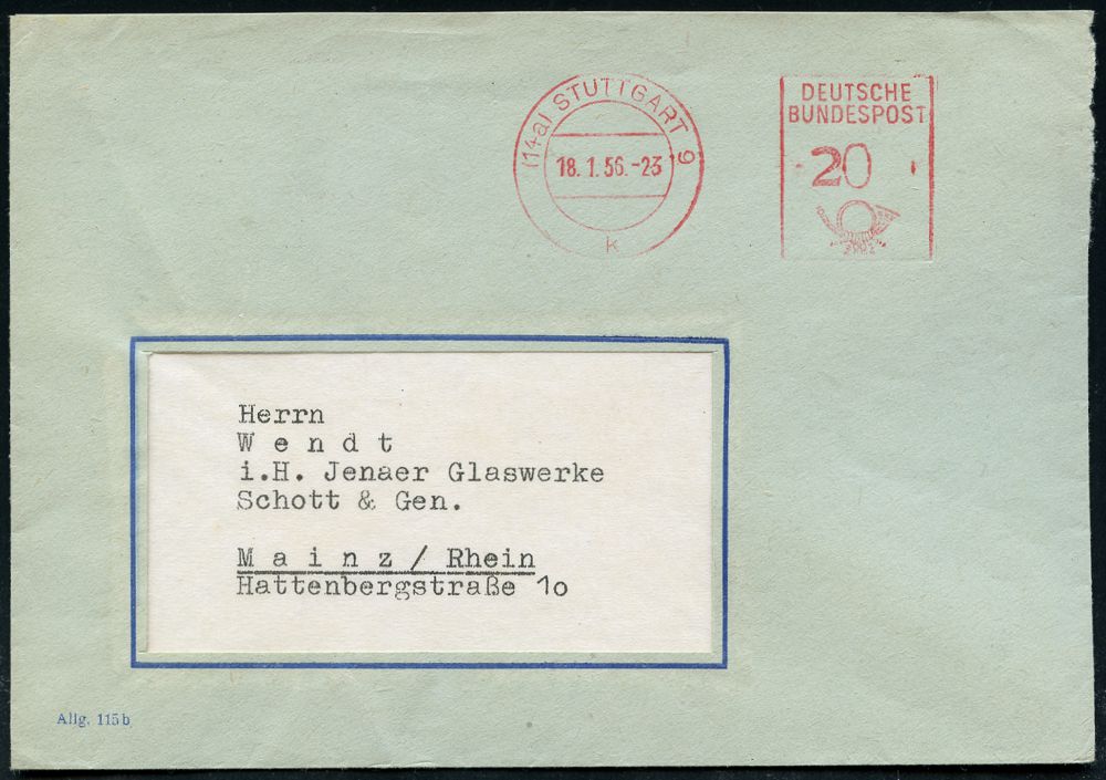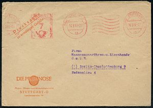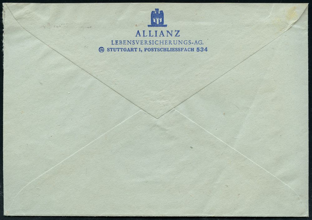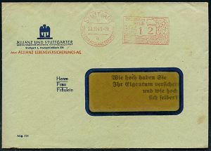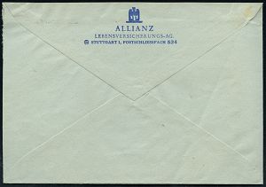 3539 | 12 € | 7000 Stuttgart Maschinen-Postfreistempel : (14a) STUTTGART 9/ k/ DEUTSCHE/ BUNDESPOST 1956 (18.1.) PFS Hochrechteck "Posthorn" 20 Pf. mit markanten, unterschiedl. Zifferntypen = Briefporto! , rs. Abs.-Vordruck: ALLIANZ LEBENSVERSICHERUNGS AG (Dü.D-17) | ![]() ![]() | |