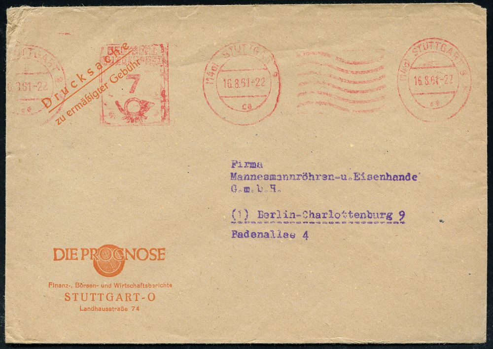 3542 | 10 € | 7000 Stuttgart Maschinen-Postfreistempel : (14a) STUTTGART 9/ ce/ DEUTSCHE/ BUNDESPOST 1961 (16.8.) Band-PFS "Posthorn" + 6 Wellen, 7 Pf. auf Firmen-Bf.: DIE PROGNOSE, Finanz-, Börsen- u. Wirtschaftsberichte (Dü.C-0, Nr.165 B) | ![]() | |