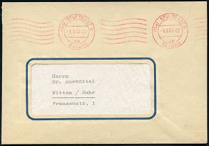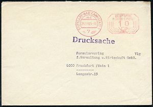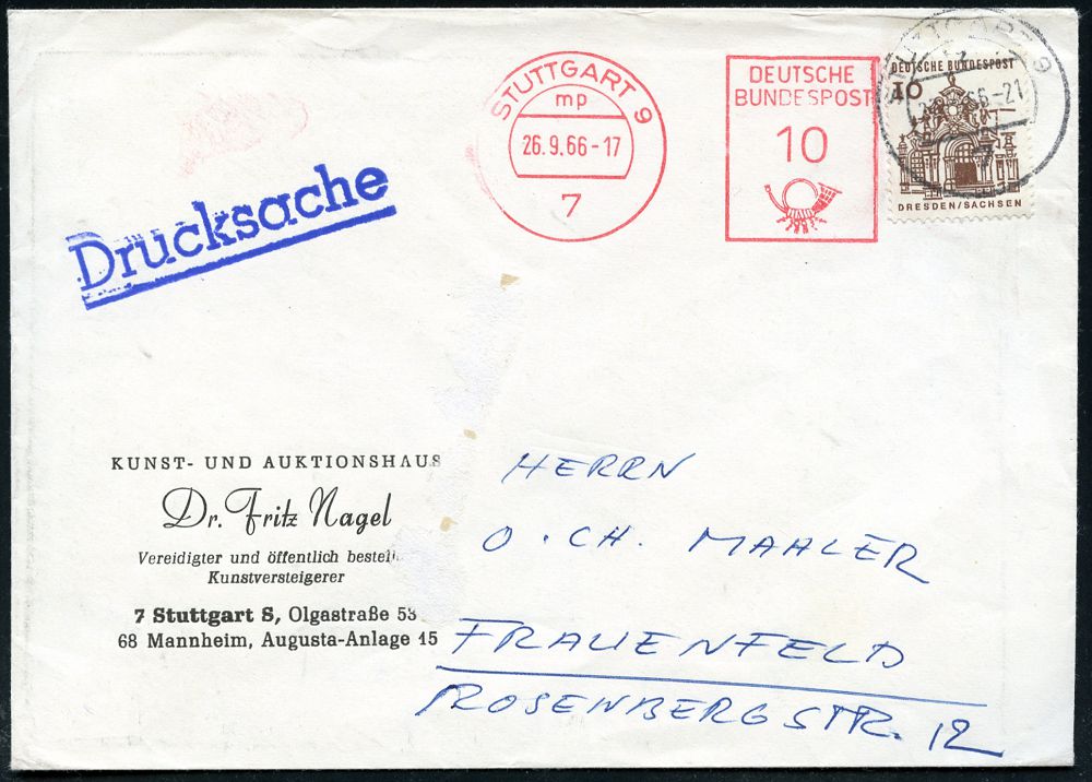 3546 | 14 € | 7000 Stuttgart Maschinen-Postfreistempel : 7 STUTTGART 9/ mp/ DEUTSCHE/ BUNDESPOST 1966 (26.9.) PFS Hochrechteck "Posthorn" 10 Pf. + Nachfrankatur 10 Pf. Bauwerke (Mi.454) Firmen-Bf.: KUNST- u. AUKTIONSHAUS Dr. Fritz Nagel n. Frauenfeld = Österreich, daher Drs.-Porto 20 Pf.! (Dü.D-17) | ![]() | |