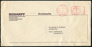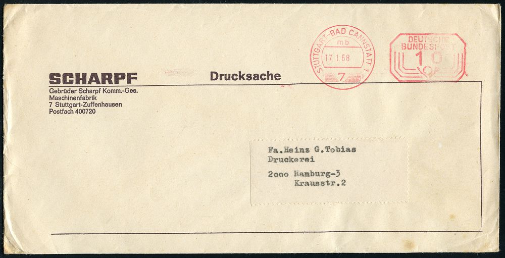 3547 | 12 € | 7000 Stuttgart Maschinen-Postfreistempel : 7 STUTTGART-BAD CANNSTATT 1/ mb/ DEUTSCHE/ BUNDESPOST 1968 (17.1.) PFS "Achteck Posthorn" = Spätverwendung 10 Pf. auf Firmen-Bf.: SCHARPF.. Maschinenfabrik (Dü.D-11, Nr.260, Spätverwendung) | ![]() | |