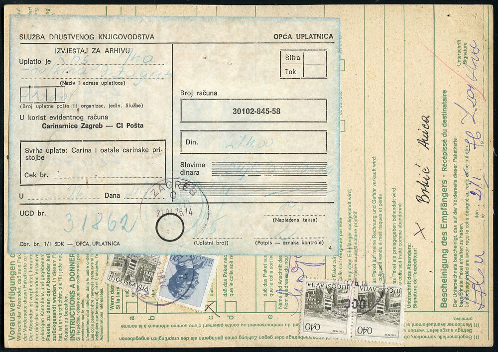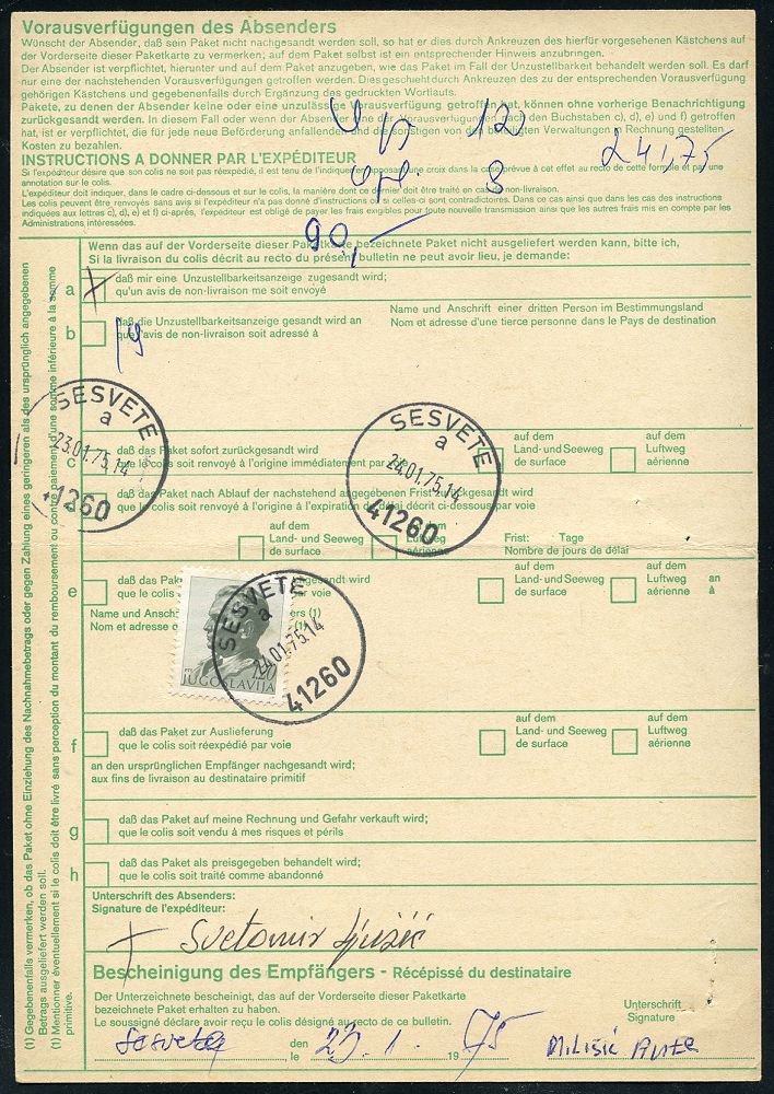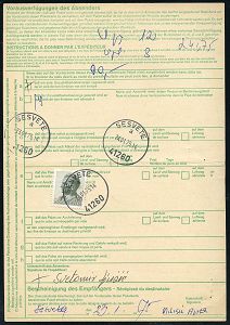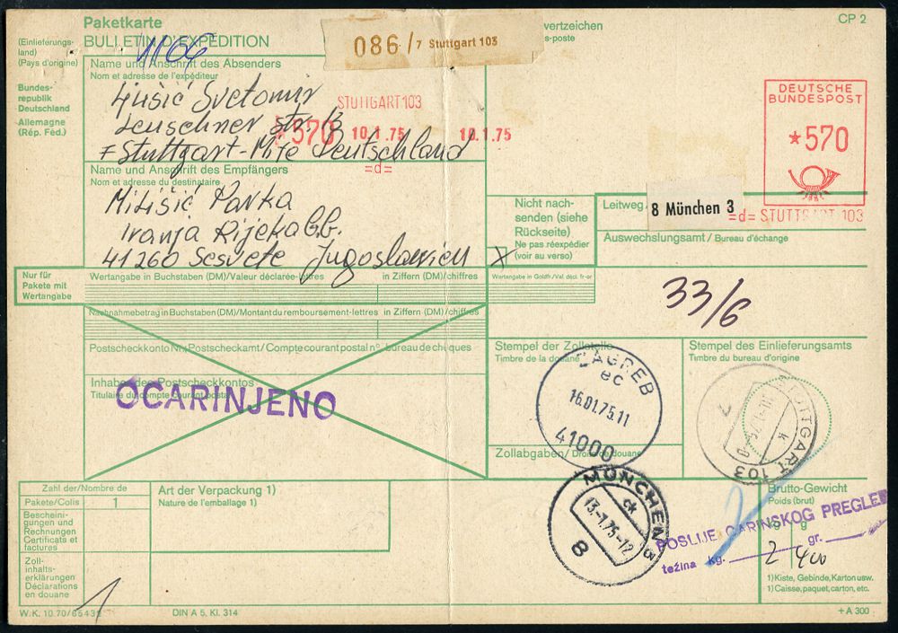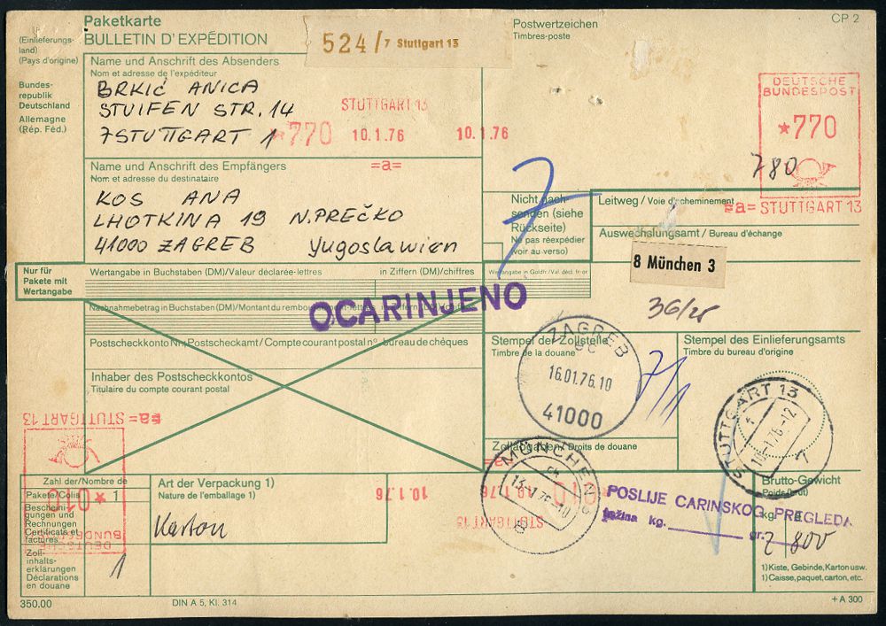 3549 | 20 € | 7000 Stuttgart Maschinen-Postfreistempel : =a= STUTTGART 13/ DEUTSCHE/ BUNDESPOST 1976 (10.1.) Paket-PFS Francotyp "Posthorn" *770 Pf. + brauner Paketzettel: 7 Stuttgart 13 + Leitzettel: 8 München 3, Ausl.-Paket-Kt. (1x Heftklammerspur) n. Jugoslawien, rs. jugosl. Freimarken + Formular, seltene Portostufe (Dü.H.6 A, Nr.23 = mit *) | ![]() ![]() | |