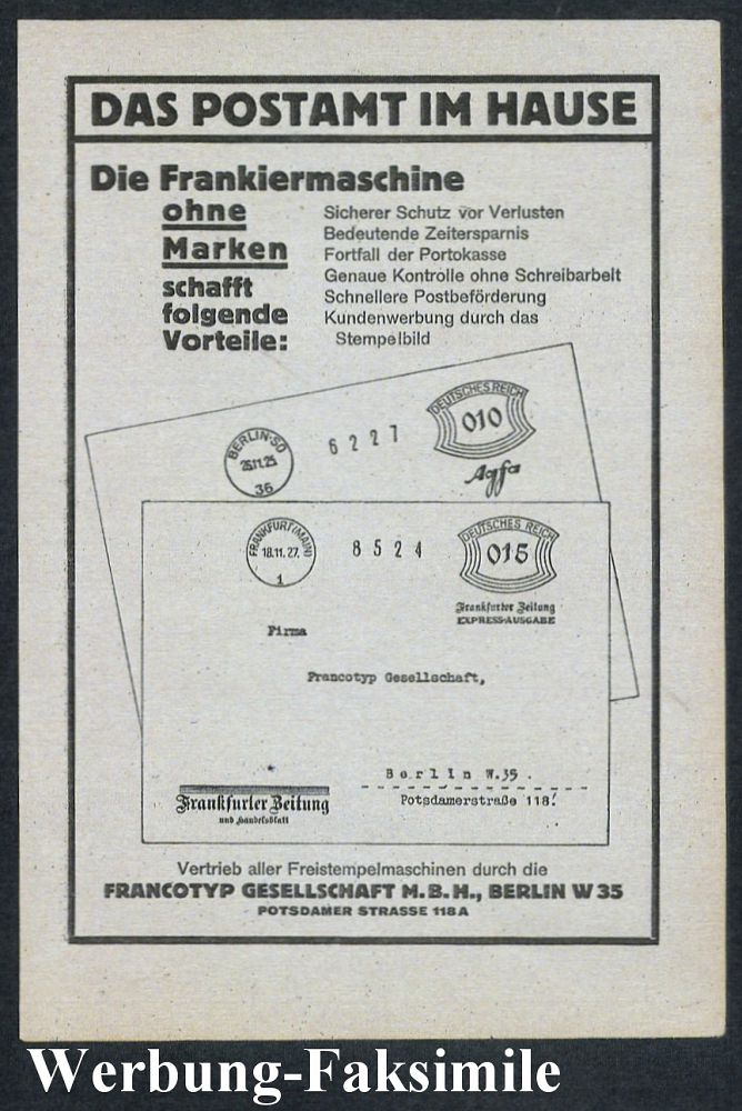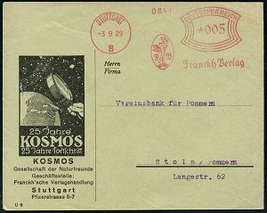 3551 | 25 € | 7000 Stuttgart Maschinen-Postfreistempel : STUTTGART/ 8/ FV/ Franckh Verlag 1929 (3.9.) AFS Francotyp "Bogenrechteck" (Engel mit Fackel u. Lorbeer) Jubil.-Reklame-Bf.: 25 Jahre KOSMOS.. Gesellschaft der Naturfreunde (Dü.E-1Ah) | ![]() ![]() | |