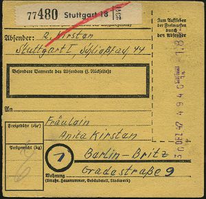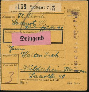 3524 | 20 € | 7000 Stuttgart Maschinen-Postfreistempel : STUTTGART/ 7 1942 (Dez.) lila Anker-Registrierkassen-FS *1.75 RM + NS-Prägeadler vertikal + schw. Paketzettel: Stuttgart 7 + rosa Label: Dringend, Inl.-Eil-Paketkarte. (Dü.H-1A /Nr.2) | ![]() | |