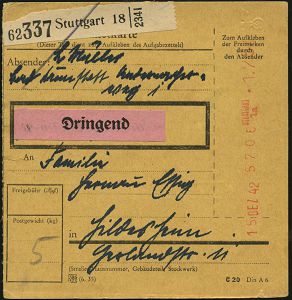 3525 | 20 € | 7000 Stuttgart Maschinen-Postfreistempel : Stuttgart/ 1a 1942 (15.12.) roter Anker-Registrierkassen-FS *1.75 RM + NS-Prägeadler vertikal + schw. Paketzettel: Stuttgart 18 + rosa Label: Dringend, Inl.-Eil-Paketkt., Paketdienst 1944 kriegsbedingt eingestellt! (Dü.H-1A/2) | ![]() | |