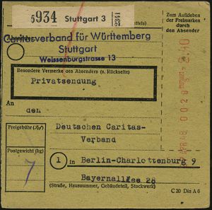 3529 | 23 € | 7000 Stuttgart Maschinen-Postfreistempel : STUTTGART/ 3 1948 (27.4.) roter Anker-Registrierkassen-PFS *2.40 RM , NS-Prägeadler abgeschliffen + schw. Paketzettel: Stuttgart 3, Inl.-Paketkt. + Abs.-3L: Caritasverband für Württemberg.. (Dü.H-1A/2 weiterverwendet) | ![]() | |