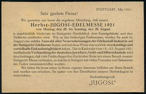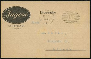 3443 | 18 € | 7000 Stuttgart Maschinen-Postfreistempel : STUTTGART/ *1I 1921 (14.6.) schwarzer Infla-Ziermuster-PFS 15 Pf. auf Reklame-Kt.: Herbst-JUGOSI-EDELMESSE 1921 (für Juweliere, Gold- u. Silberschmiede n. Lübeck (Dü.D-1, Nr.2) | ![]() ![]() | |