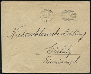 3444 | 15 € | 7000 Stuttgart Maschinen-Postfreistempel : STUTTGART/ *1I 1921 (29.6.) schwarzer Infla-Ziermuster-PFS 15 Pf. auf Fern-Bf. n. Görlitz (Dü.D-1, Nr.2) | ![]() | |