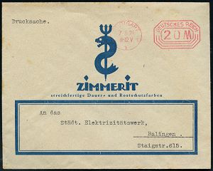 3454 | 16 € | 7000 Stuttgart Maschinen-Postfreistempel : STUTTGART/ *1I/ DEUTSCHES REICH 1923 (7.3.) Infla-PFS "Achteck" 20 M(ark) auf dekorativem Firmen-Bf.: ZIMMERIT.. Dauer- u. Rostschutzfarben (rs. Abs.: GEBr. SIMON) kl. Stockpunkte, Fern-Drs.-Bf. (Dü.D-3, Nr.44) | ![]() ![]() | |