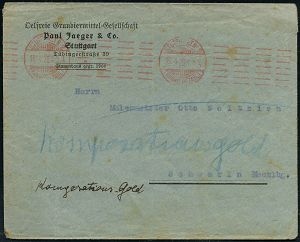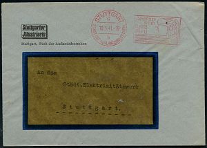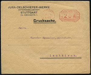 3460 | 15 € | 7000 Stuttgart Maschinen-Postfreistempel : STUTTGART/ *1I/ DEUTSCHES REICH 1923 (29.6.) Infla-PFS 20 M(ark) auf Firmen-Bf.: JURA-OELSCHIEFER-WERKE AG (Dü.D-3, Nr.44) | ![]() | |