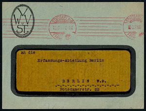 3502 | 10 € | 7000 Stuttgart Maschinen-Postfreistempel : STUTTGART/ 1/ a/ STADT DER AUSLANDSDEUTSCHEN/ DEUTSCHES REICH 1937 (22.5.) PFS "Achteck" einzeilig miit NS-"Ehrentitel" STADT DER AUSLANDSDEUTSCHEN (SDA) ab 1937 verwendet auf Dienst-Bf.: INDUSTRIE- U. HANDELSKAMMER.. (Dü.D-4 SDA = Erstjahr) | ![]() | |