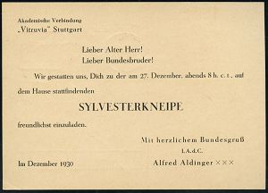 3483 | 12 € | 7000 Stuttgart Maschinen-Postfreistempel : STUTTGART/ *1*/ DEUTSCHES REICH 1930 (15.12.) PFS "Achteck" 3 Pf. auf Einladungs-Kt. der Studenten-Verbindung "Vitruvia" zur Sylvesterfeier (Dü.D-4) | ![]() ![]() | |