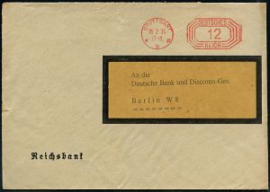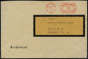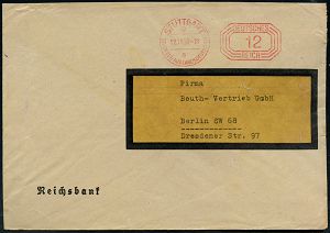 3509 | 12 € | 7000 Stuttgart Maschinen-Postfreistempel : STUTTGART/ 9/ b/ SDA/ DEUTSCHES REICH 1939 (5.4.) PFS "Achteck" einzeilig, 12 Pf. = Briefporto! auf Reichsbank-Bf. (Dü.D-4 SDA) | ![]() | |