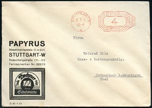 3492 | 10 € | 7000 Stuttgart Maschinen-Postfreistempel : stuttgart 9/ a/ DEUTSCHES/ REICH 1933 (8.7.) PFS "Achteck" zweizeilig 4 Pf. auf Firmen-Bf.: PAPYRUS Maschinenhandels GMBH.. mit Logo (Dü.D-5) | ![]() | |