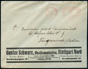 3494 | 8 € | 7000 Stuttgart Maschinen-Postfreistempel : STUTTGART/ *9a/ DEUTSCHES/ REICH 1934 (20.8.) PFS "Achteck" zweizeilig, 3 Pf. auf Firmen-Bf.: Gustav Schwarz, Obstkommission.. (Dü.D-5) | ![]() | |