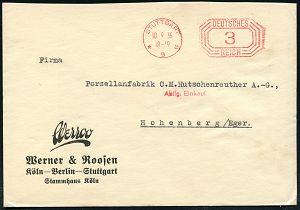 3497 | 8 € | 7000 Stuttgart Maschinen-Postfreistempel : STUTTGART/ *9a/ DEUTSCHES/ REICH 1935 (10.9.) PFS "Achteck" zweizeilig, 3 Pf. auf Firmen-Bf.: Werroo, Werne & Roosen.. Stammhaus Köln (Dü.D-5) | ![]() | |