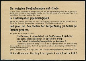 3505 | 8 € | 7000 Stuttgart Maschinen-Postfreistempel : STUTTGART/ 9/ a/ SDA/ DEUTSCHES/ REICH 1938 (9.6.) PFS "Achteck" zweizeilig mit NS-Titel "SDA" auf (halber) Reklame-Kt.: Kohlhammer-Verlag zu Dienst- u. Tarifordnungen (Dü.D-5 SDA) | ![]() ![]() | |
