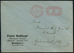 3506 | 8 € | 7000 Stuttgart Maschinen-Postfreistempel : STUTTGART/ 9/ a/ SDA/ DEUTSCHES/ REICH 1938 (6.7.) PFS "Achteck" zweizeilig, 3 Pf. auf Firmen-Bf.: Franz Roßkopf, Chemische Produkte "Steintod".. (Dü.D-5 SDA) | ![]() | |