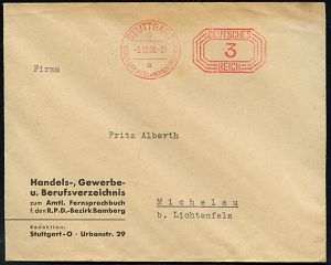 3508 | 8 € | 7000 Stuttgart Maschinen-Postfreistempel : STUTTGART/ 9/ a/ SDA/ DEUTSCHES/ REICH 1938 (5.12.) PFS "Achteck" zweizeilig, 3 Pf. auf Vordruck-Bf.: Handels-, Gewerbe- u. Berufsverzeichnis zum Amtl. Fernsprechbuch f. den R.P.D.-Bezirk Bamberg (Dü.D-5 SDA) | ![]() | |