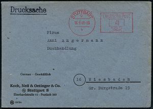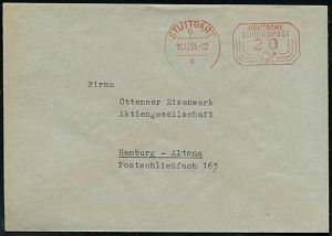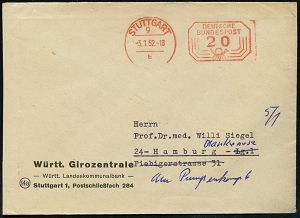 3536 | 8 € | 7000 Stuttgart Maschinen-Postfreistempel : STUTTGART/ 9/ b/ DEUTSCHE/ BUNDESPOST 1952 (3.1.) aptierter PF "Achteck Posthorn", alte NS-Inschrift "STADT DER AUSLANDSDEUTSCHEN" entfernt , Firmen-Bf.: Württ. Girozentrale.. (Dü.D-16, Nr.273, aptiert) | ![]() | |