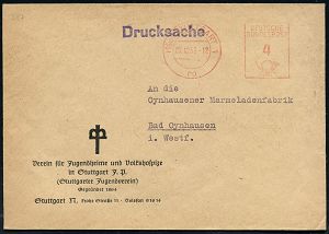 3538 | 10 € | 7000 Stuttgart Maschinen-Postfreistempel : (14a) STUTTGART 1/ ro/ DEUTSCHE/ BUNDESPOST 1953 (7.12.) PFS Hochrechteck "Posthorn" 4 Pf. auf Vordr.-Bf.: Verein für Jugendheime u. Volkshospize.. mit Kreuzsymbol der Inneren Mission (Dü.D-17) | ![]() | |