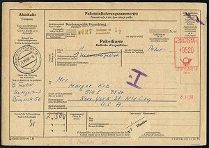 3540 | 25 € | 7000 Stuttgart Maschinen-Postfreistempel : STUTTGART 18/ =e= 1958 (21.11.) Paket-PFS Francotyp "Posthorn", Datum u n t e r dem Wertrahmen! *0520 Pf. + brauner Paketzettel: Stuttgart 18/ Auslandsschalter + 2K-Steg: (14 a) STUTTGART 18/bl + Leizettel: Hamburg, Übersee-Paket-Kt. n. USA, seltene Portostufe ! (Dü.H-6 B) | ![]() | |