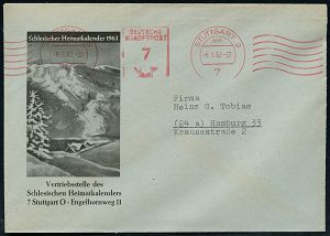 3543 | 14 € | 7000 Stuttgart Maschinen-Postfreistempel : 7 STUTTGART 9/ mn/ DEUTSCHE/ BUNDESPOST 1962 (6.6.) Band-PFS "Posthorn" + 6 Wellen + neue PLZ auf Reklame-Bf.: Vertriebsstelle des Schlesischen Heimatkalenders.. (Dü.C-9, Nr. 165 B, neue PLZ) | ![]() | |