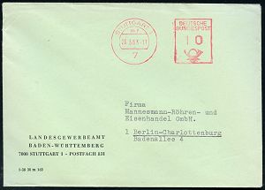 3544 | 8 € | 7000 Stuttgart Maschinen-Postfreistempel : 7 STUTTGART 1/ mf/ DEUTSCHE/ BUNDESPOST 1963 (26.3.) PFS Hochrechteck "Posthorn" mit neue PLZ auf Dienst-Bf.: LANDESGEWERBEAMT BADEN-WÜRTTEMBERG.. n. West-Berlin (Dü.D-17, neue PLZ) | ![]() | |