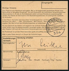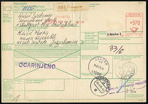 3548 | 18 € | 7000 Stuttgart Maschinen-Postfreistempel : =d= STUTTGART 103/ DEUTSCHE/ BUNDESPOST 1975 (10.1.) Paket-FS Francotyp "Posthorn" ohne PLZ *570 Pf. + brauner Paketzettel: 7 Stuttgart 103 , rs. Ausl.-Paket-Karte (Mittelbugspur u. 1x klammerspur) n. Jugoslawien, rs. jogosl. Freimarke seltene Portostufe! (Dü.H-6 a, Nr.23 = mit *) | ![]() ![]() | |